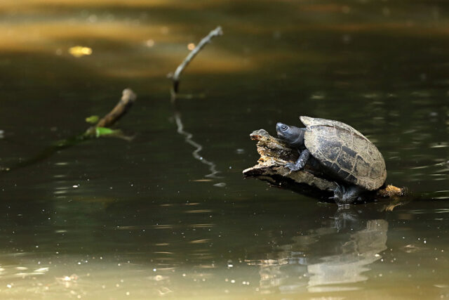 | どうやって冬眠するの? | カメ類は、寒い冬になると体がうまく動かなくなってしまいます。だから、安全であったかい場所にかくれて冬眠します。 |