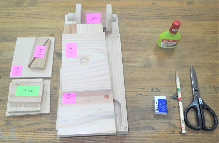 それぞれパーツごとにアルファベットをつけて、材料が混ざらないように準備をします。(材料はホームセンターでも購入できますよ!)