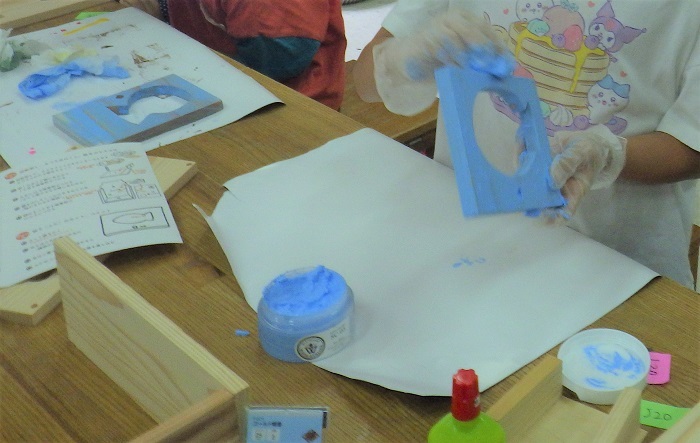 つぎは、カラーニスでペイントタイム!カラーニスというのは、木に色をつけるもので、木の模様を残したまま、きれいにぬることができます。好きな色をえらんで、世界にひとつだけの作品をつくろう!